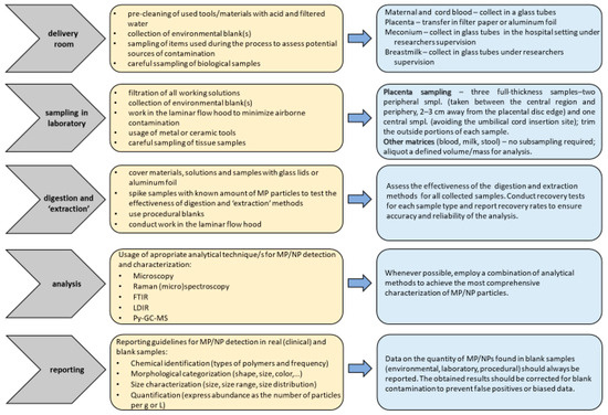 As mentioned previously, plastic particles are ubiquitous in the environment, making sample contamination during collection, preparation, and analysis almost inevitable. This high risk of contamination complicates analyses of MP/NP presence, requiring researchers to exercise extra care and effort when handling samples to be able to differentiate between MP/NP particles that are actually present in the sample and those introduced through external contamination. In general, to minimize cross-contamination during MP/NP analysis in human biological samples, several key practices should be followed: using non-plastic equipment; avoiding the use of synthetic textiles during sampling and sample handling; implementing rigorous cleaning procedures for working surfaces, tools and consumables; utilizing both procedural and environmental blanks to control for contamination; keeping samples and equipment covered with non-plastic items; and conducting sample handling in clean rooms and/or laminar-flow hoods with controlled air circulation [49].