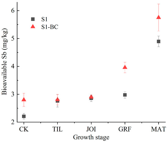 The bioavailable Sb was altered dynamically with rice growth and BC addition (Figure 2). In S1, the bioavailable Sb concentration increased from 2.21 mg/kg to 4.90 mg/kg during rice growth, primarily due to the soil’s overall shifts from an acidic to a neutral state, and from an oxidation to a reduction state, and a rise in DOC [49,50]. In S1-BC, the variation in bioavailable Sb followed a similar trend as in S1, increasing from 2.80 mg/kg to 5.75 mg/kg, a rise of 1.57–32.97% in the presence of BC, indicating that biochar boosted the bioavailable Sb in the rhizosphere soil as adding BC increased the pH and DOC content but decreased Eh [49,50]. In general, DOC derived from BC with abundant functional groups interacts with Sb through complexation, chelation, and adsorption, thereby increasing its bioavailability [51,52]. Thus, we conclude that the bioavailable Sb varied with the rice growth, and adding BC increased the bioavailable Sb concentrations.