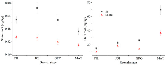 Sb levels in rice shoots and roots at four growth stages (S1: soil; S1-BC: soil with biochar).