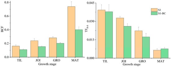The BCF and TF of Sb during rice growth (S1: soil; S1-BC: biochar-amended soil).