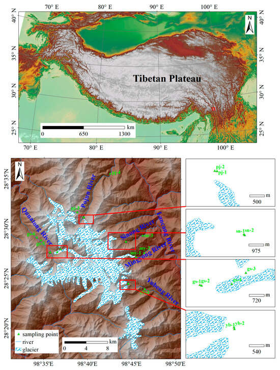 Due to low temperatures and pristine ecological conditions, the Tibetan Plateau (TP) is commonly designated as the “Third Pole” of the Earth [25], characterized by its remoteness and inaccessibility. Additionally, the TP is the origin for many major rivers in Asia and is a vital water resource for about one-sixth of the global population [26]. However, the TP is located at a low latitude and is surrounded by the rapidly industrializing nations of South Asia and Southeast Asia. Semi-volatile POPs from these sources can undergo LRAT and subsequently experience cold-trapping in the TP regions [11,27]. In glacial watersheds, the accumulation of POPs in the aquatic environment is the result of an interaction between the atmosphere and these pollutants that occurs through falling snow and precipitation, leading to the environmental and ecological integrity of the TP being affected by anthropogenic activities from these sources. As a typical representative of the temperate glacial watersheds in southeastern TP, the Meili Snow Mountains (98°30′-98°46′ E, 28°10′-28°41′ N) constitute a continuous mountain range and serve as an integral part of the Hengduan Mountains. The area with the highest elevation is Kawagebo Peak, at 6740 m above sea level. This mountain range is vital for supplying agricultural irrigation and domestic water to populations residing in downstream areas; thus, it plays a critical role in the ecological health and well-being of these communities. The Meili Snow Mountains are also in proximity to the Indian subcontinent, which is characterized by its large-scale manufacture and use of POPs [28].