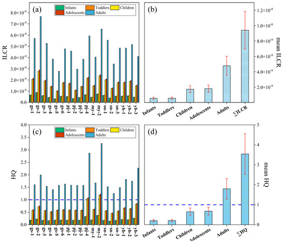 A comparison of potential health risks occurring through the ingestion of the surface water. Carcinogenic exposure risks (ILCR (a) and mean ILCR (b)) and non-carcinogenic exposure risks (HQ (c) and mean HQ (d)) are shown.