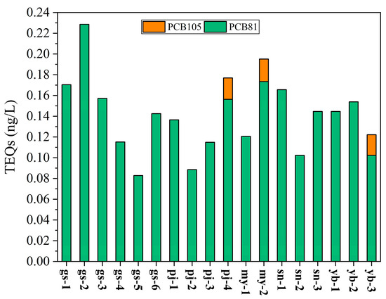 Considering the toxicity and bioaccumulation properties of PCBs, and the vulnerable ecological environment of the TP, it is crucial to evaluate the potential ecological risk of DL-PCBs in this region. In this study, we estimated the toxic equivalency concentrations (TEQs) by multiplying the concentration of each DL-PCB by TEF [33]. The TEQ of each DL-PCB congener varied from 0 to 0.17 ng/L (Figure 4). The sum of the TEQs (∑TEQs) for the DL-PCBs detected in all samples ranged from 0.09 to 0.23 ng/L, with a mean value of 0.14 ng/L (Figure 4). The results showed that the ∑TEQs varied greatly and were mainly contributed to by PCB81. The highest ∑TEQ value was at gs-2, followed by my-2 and pj-4, while the lowest appeared at gs-5, which was a somewhat different pattern to that observed with PCB52 as the primary indicator PCB.