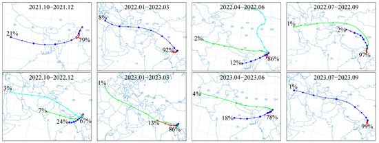 A cluster analysis of the 5-day backward trajectories of air masses in the Meili Snow Mountains from October 2021 to September 2023. The colored lines present different clusters.
