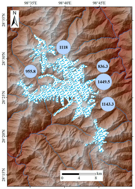 Glacial meltwater and river water samples were collected from the Meili Snow Mountains in October 2023 (Figure 1). Five river water samples were collected from the downstream regions of rivers originating from glacial meltwater across various altitudinal gradients, and eighteen water samples were collected and analyzed in total. The sampling points were determined by global navigation satellite system equipment, and the comprehensive details are provided in Table S1. Each sample was stored in a clean 2 L low-density polyethylene bottle (Thermo Scientific, Waltham, MA, USA) that was pre-cleaned with ultra-pure water, methanol, and acetone to ensure pollution-free conditions, then washed with water from a particular sampling point. The collected samples were then filtered through 0.45 μm membranes to remove particulate matter and transferred to new low-density polyethylene bottles. The samples were preserved at −4 °C during transport to the analytical laboratory at the Beijing Institute of Geology of Nuclear Industry, where they were subsequently stored at −18 °C until analysis.