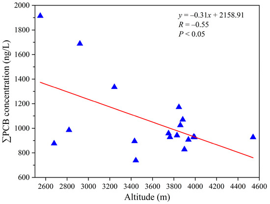 Figure 7 displays the mean ∑3PCB concentrations in water samples from five different watersheds, including the Qunatong, Pojun, Mingyong, Sinong, and Yubeng River watersheds (Table S1). The highest mean ∑3PCB concentration appeared at the Mingyong River watershed (1449.5 ng/L), followed by the Yubeng River watershed (1143.3 ng/L) and the Pojun River watershed (1118 ng/L), while the lowest was at the Sinong River watershed (836.3 ng/L). The three regions with relatively high mean ∑3PCB concentrations are located in proximity to densely populated villages and towns, and also serve as tourist destinations. Consequently, they are particularly vulnerable to pollutants originating from local anthropogenic sources. Additionally, previous studies have demonstrated that among the various factors affecting POP concentrations, such as distance from sources, latitude, altitude, and other variables [53,54], altitude is the biggest determinant [10]. This study indicates that ∑3PCB levels exhibit a decreasing trend with increasing altitude (Figure 8), which might be attributed to the enhancement of local convergence and enrichment mechanisms. Variations in atmospheric pressure, the rates of dry and wet deposition, and the distance from pollution sources can affect the ∑POP concentration along with changes in altitude [10,53]. Generally, the low-altitude regions located in densely populated villages and towns are impacted by various sources of pollution. Anthropogenic activities, such as the combustion of wood and coal for heating, vehicular transportation, untreated waste water discharge, waste incineration, industrial processes, and the disposal of electronic waste [3], contribute to the introduction of PCB pollutants into the water-vapor interface, thereby exerting a substantial effect on aquatic ecosystems. Therefore, it is essential to comprehend the influences of local anthropogenic activities on the release of PCBs into the environment.