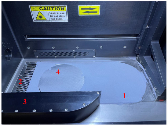 Sampling locations for Scalmalloy powders within the LPBF system, indicated by numbered labels. The dispenser (1) represents the as-received virgin powder (feed region) prior to processing. The overflow (2), exhaust (3), and build plate (4) samples were collected 44 h after the completion of the printing process to assess changes due to thermal exposure.