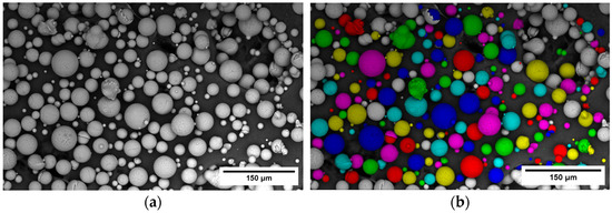 Gas-atomized Scalmalloy®® (APWORKS GmbH, Taufkirchen, Germany) metal powder was used as feedstock with chemical composition presented in Table 1. The term ‘Al balance’ indicates that aluminum is the primary element in Scalmalloy, and its content adjusts to balance the total composition after accounting for the listed alloying elements. The particle size distribution (PSD), shape, and morphology of the Scalmalloy powder samples were determined using Scanning Electron Microscopy (SEM) (PhenomProX, Thermo Fisher Scientific Inc., Waltham, MA, USA) and an add-on image analysis software (Phenom ParticleMetric, V1.2.2.0) from ThermoFisher Scientific, Waltham, MA, USA. The software highlights the detected particles according to user-defined settings, which can be adjusted to enhance particle detection and improve the identification of irregular and agglomerated particles (e.g., Figure 2). To ensure statistically relevant results, three measurements comprising 120 SEM micrographs per sample were acquired through Automated Image Mapping and analyzed, with each micrograph captured at a 500 μm Field of View (FOV). To assess the shape and morphology of powder particles, the shape descriptor of circularity and convexity was calculated based on the samples’ volumetric distribution.