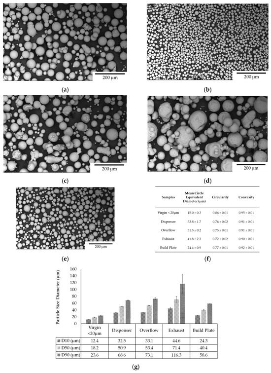 SEM images of Scalmalloy powder showing particle morphology across various samples. (a) Dispenser sample, (b) Virgin powder (<20 μm), (c) Overflow sample, (d) Exhaust sample, and (e) Build plate sample, after 44 h of printing. (f) Table summarizing the mean circle equivalent diameters along with circularity and convexity values for each sample. (g) Bar graph illustrating the D10, D50, and D90 particle size distributions for each sample.