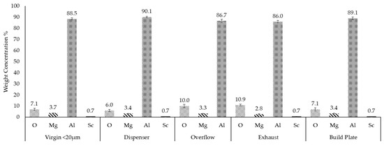 The aluminum content remained dominant (~85 to 90 wt.%), as expected for Scalmalloy composition, with minimal changes across the different samples (Figure 4). These findings highlight the influence of powder processing conditions on particle morphology and oxidation. While the dispenser powder maintained good spherical morphology and low oxidation levels, the exhaust and overflow samples exhibited higher oxidation and broader PSD, indicating potential degradation and contamination risks. The oxygen content in fine (<20 µm) virgin powder also suggests that sieving contributes to oxidation likelihood, likely due to exposure to an open, oxidative atmosphere with up to 50% relative humidity, highlighting the need for controlled storage and handling conditions.