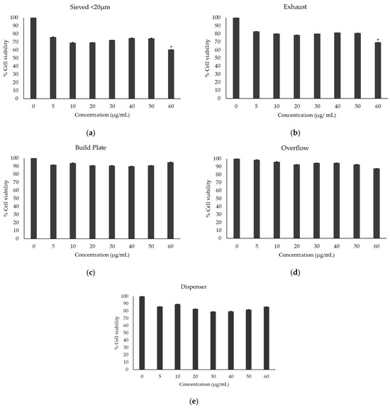 The MTT assay was conducted to evaluate the cytotoxic effects of Scalmalloy powder samples on A549 lung epithelial cells following a 48-h exposure across a range of concentrations. The results indicate that most samples did not induce significant cytotoxicity (Figure 5). However, the exhaust-derived powder at the highest tested concentration (60 μg/mL) caused a statistically significant reduction in cell viability (p-value < 0.05) (Figure 5b). Notably, the sieved powder < 20 μm resulted in cell viability below 80% at all tested concentrations with statistical significance (p-value < 0.05) (Figure 5a). The reduction in cell viability observed in the exhaust and sieved sample < 20 μm is likely linked to particle morphology and reduced particle size, respectively, as identified through SEM analysis. The cell viability analysis for the build plate, overflow, and dispenser samples did not reveal significant cytotoxic effects even for the highest concentration tested, in contrast to the abovementioned cases.