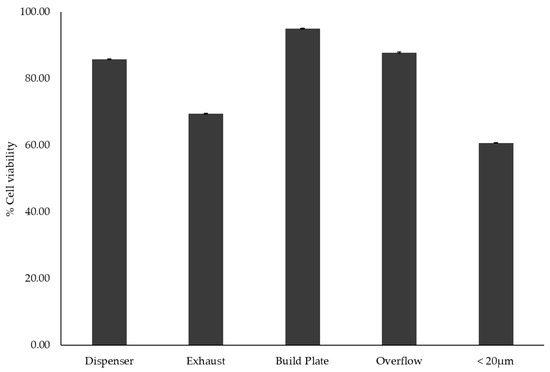Cell viability rates in the 60 μg/mL concentration, indicating the highest viability for the sample obtained from the build plate and the lowest viability for the sample that was sieved under 20 μm.