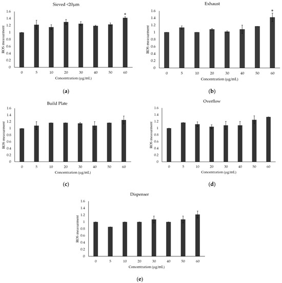 The virgin < 20 μm sample (Figure 7a) exhibited a modest but statistically significant (p < 0.05) increase in ROS levels at the highest concentration (60 μg/mL), suggesting that finer particles may induce oxidative stress due to their larger surface area and higher reactivity. Similarly, the exhaust sample (Figure 7b) demonstrated a significant (p < 0.05) ROS increase at 60 μg/mL, aligning with its previously observed cytotoxic effects and high oxidation levels. This suggests that powder collected from the exhaust area exhibits ROS-inducing potential due to the presence of oxidized metal surfaces, such as aluminum or magnesium oxides, or surface modifications that enhance oxidative stress responses in cells. In contrast, the build plate sample (Figure 7c) maintained relatively stable ROS levels across all concentrations, indicating minimal oxidative stress induction. This trend was also observed in the overflow (Figure 7d) and dispenser (Figure 7e) samples, which exhibited consistently low ROS levels, suggesting that these powders have minimal oxidative reactivity. The results imply that powders subjected to extensive oxidation, such as the exhaust sample, or those with smaller particle sizes, such as the virgin < 20 μm fraction, are more prone to inducing oxidative stress in biological systems. Overall, these findings suggest that oxidative stress responses vary depending on powder processing and collection conditions. The elevated ROS levels in the exhaust and virgin < 20 μm samples underscore the potential impact of oxidation and particle size and morphology on cellular responses.