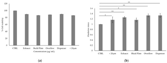 Indirect cytotoxicity assessment via media incubation did not show noticeable toxicity across samples. The possible release fraction from powder-incubated media did not induce significant cytotoxic effects in A549 cells, suggesting that the concentration of soluble metal ions released from the samples under the tested conditions was not sufficient to cause acute toxicity, despite the pronounced morphological and chemical variations across the samples, as presented in previous sections. Nevertheless, the exhaust (<20 um), overflow, and dispenser samples present a significant difference with respect to the CTRL sample (p value < 0.01), suggesting oxidative stress and a ROS level increase, resulting in an imbalance between antioxidants and reactive oxygen species (ROS). At this stage, and prior to cell death, cells respond to oxidative stress by activating or silencing genes that encode defensive enzymes, transcription factors, and structural proteins in order to restore redox balance [93].