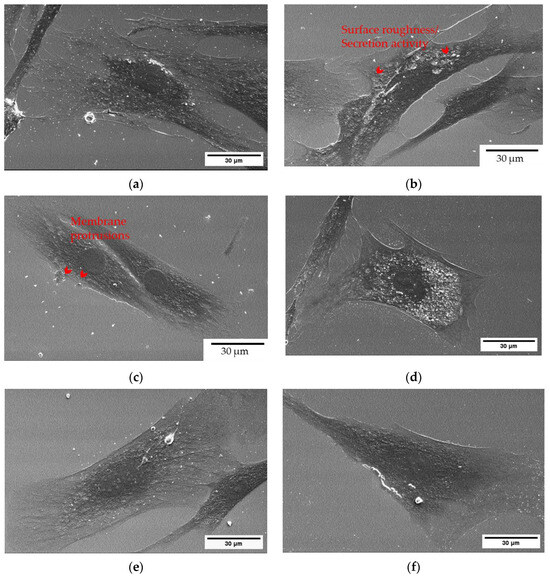 Cells were treated with 60 μg/mL of Scalmalloy powder samples for 48 h, following the protocol described in the Section 2. The SEM images in Figure 9 present morphological differences in the treated cells, depending on the source of the powder. The observed differences highlight the impact of specific powder fractions on cellular integrity and structural organization.