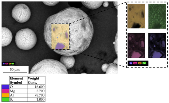 According to the EDS results (Figure 4), oxidation levels varied among the samples, with the highest oxygen content measured in the exhaust (10.9 wt.%) and overflow (10.0 wt.%) powders via EDS. This increase in oxygen concentration can be attributed to prolonged exposure to high temperatures in the LPBF process for both exhaust and overflow powder samples, leading to oxidation. Magnesium loss was also observed, as confirmed based on previous studies [69]. The slight increase in oxygen content in the virgin <20 μm sample compared to the dispenser sample is likely a result of increased surface area and exposure to ambient conditions (25 °C and 50% relative humidity) during handling and sieving [70,71,72]. Further EDS elemental map analysis (Figure 10) confirmed localized oxidation, with particles exhibiting darker surface regions having significantly higher oxygen content, containing O (16.6 wt.%), Mg (3.7 wt.%), Al (78.7 wt.%), and Sc (1.0 wt.%). An increased concentration of magnesium was also observed in the dark oxidized regions, indicating magnesium oxides. In aluminum–magnesium alloys, magnesium preferentially oxidizes over aluminum, forming MgO and MgAl2O4 in the oxide scale. The addition of Mg prevents the formation of Al2O3, leading to Mg-based oxides instead [73].