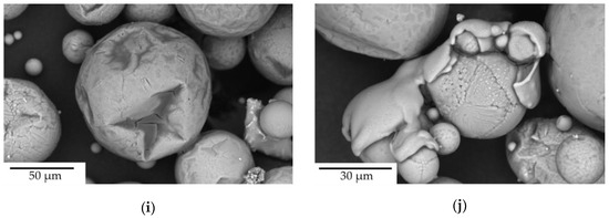 Scanning Electron Microscope (SEM) images of powder particles in an exhaust sample, highlighting various morphological defects: (a–d) Wide-field SEM images showing an overview of the powder sample, revealing a mixture of spherical, irregular, and agglomerated particles. Red arrows indicate key defects such as satelliting, oxidation, agglomeration, and cracking. (e) A satellited and agglomerated particle, where multiple smaller particles adhere to a larger core. (f) Agglomerated and elongated particles, formed due to partial fusion and sintering effects. (g) An oxidized particle with multiple satellite particles, exhibiting surface cracks and rough textures. (h) Satellited and oxidized particles with adhered smaller spheres and surface irregularities. (i) A sharp-edged and oxidized particle with a fractured surface. (j) Agglomerated and satellited particles exhibiting fused structures, areas of re-solidified melt, and attached smaller particles.