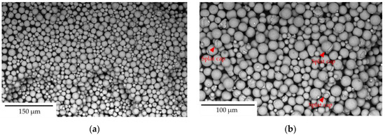 Scanning Electron Microscope (SEM) images of virgin powder particles (sieved < 20 µm), illustrating their morphological characteristics: (a,b) High-resolution images depicting the fine and predominantly smooth spherical particles characteristic of the sieved < 20 µm powder. The only notable morphological feature is the presence of splat caps on some particles, which are highlighted with red arrows, and which result from the atomization process.