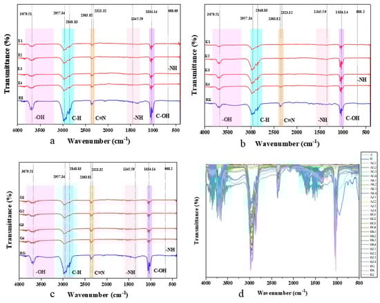 FT-IR of ZnCl2-activated N-doped biochars synthesized from different biomass feedstocks at pyrolysis temperatures of 300–600 °C. (a) Comparison of infrared spectra of raw material RZ and raw material zinc chloride activated nitrogen modified biochar (Z1–Z4). (b) Comparison of infrared spectra of raw material RK and raw material zinc chloride activated nitrogen modified biochar (K1–K4). (c) Comparison of infrared spectra of raw material RG and raw material zinc chloride activated nitrogen modified biochar (G1–G4). (d) Overlay of FT-IR spectra for all feedstocks (RZ, RK, RG) and their ZnCl2-activated N-doped biochars synthesized at four pyrolysis temperatures (Z1–Z4, K1–K4, G1–G4). Notes: Sample nomenclature: Subscripts denote pyrolysis temperatures (1: 300 °C, 2: 400 °C, 3: 500 °C, 4: 600 °C).