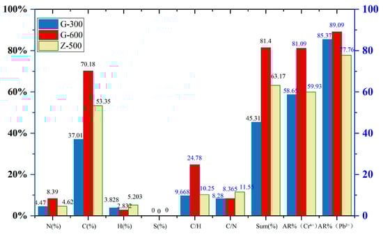 To explore the influence of pyrolysis temperature and biomass type, comparisons were made between G-600 and G-300 (same biomass, different temperatures), and between G-600 and Z-500 (different biomass, both with relatively high adsorption). The elemental composition (C, H, N, S) was determined for each sample, and relevant parameters including C/H, C/N ratios, and the total elemental proportion (Sum%, the combined wt.% of C, H, N, and S) were calculated. These data were then correlated with the adsorption removal efficiencies (AR%) of Cr6+ and Pb2+, as illustrated in Figure 6.