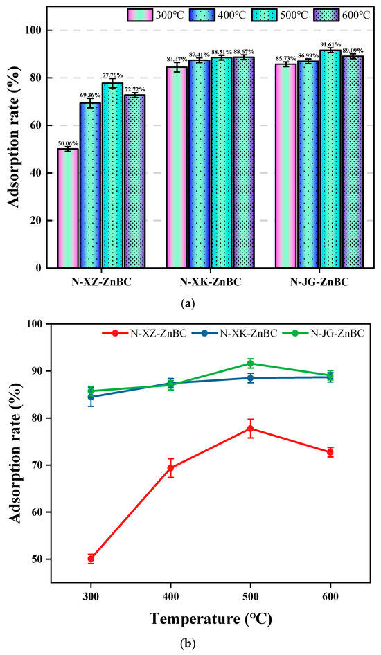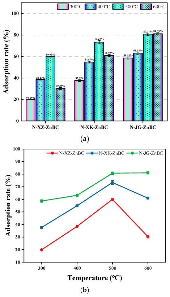 Apricot shell, apricot branch, and corn stalk were selected as raw materials to prepare biochar. The adsorption performance of biochar varies depending on the raw material [34]. A comparison of these results indicates that biochar derived from apricot shell (XK-N-ZnBC) and corn stalk (JG-N-ZnBC) consistently demonstrated high Pb2+ adsorption rates (>84.47%) across all temperatures (300–600 °C), with similar overall performance for both raw materials. In contrast, biochar derived from apricot branch (XZ-N-ZnBC) showed significantly lower Pb2+ adsorption rates, with a maximum value of 77.76%.