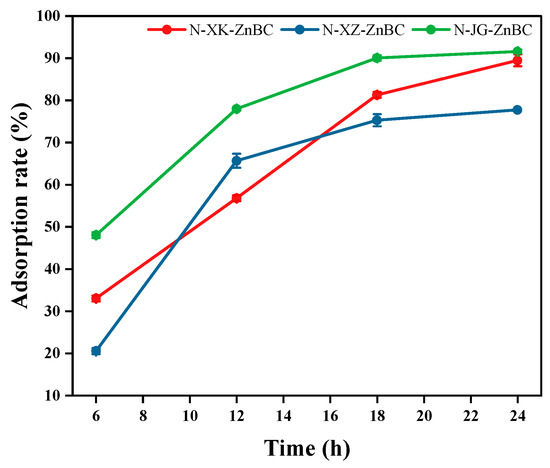 To explore the adsorption rates at various time intervals, nitrogen-doped biochar prepared from three biomass feedstocks was tested at four time points: 6, 12, 18, and 24 h. Taking the adsorption of lead ions by biochar prepared at 500 °C as an example, the adsorption rates for apricot shell biochar were 33.02%, 56.79%, 81.32%, and 89.51% at the respective time intervals. For apricot branch biochar, the adsorption rates were 20.55%, 65.68%, 75.30%, and 77.76%. Corn stalk biochar exhibited adsorption rates of 48.06%, 77.96%, 90.06%, and 91.61% over the same time periods. The line chart illustrating the adsorption rates over time is shown in Figure 9.