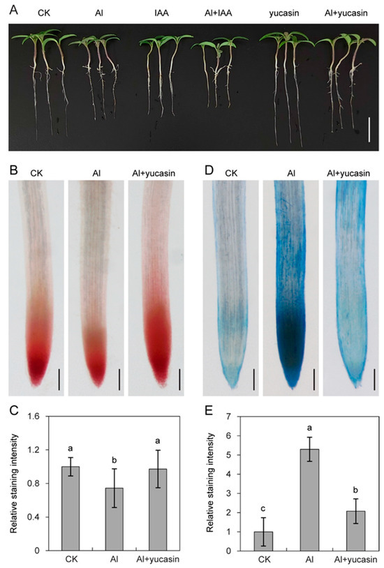 Maintaining the cell activity of root tips is the main driver promoting plant root elongation. To analyze the roles of yucasin on the root activity in tomatoes under Al toxicity, cell viability and cell death were assessed by histochemical staining. As shown in Figure 1, the TTC staining intensity was significantly reduced, while the Evans blue staining intensity was significantly enhanced in tomato seedling roots exposed to Al stress (Figure 1B–E). This indicates that Al stress induced cell death and reduced cell viability. Consistent with the root growth phenotype, the effects of Al toxicity were reversed by applying yucasin. Compared to tomato seedlings exposed to Al stress, adding yucasin increased root activity and reduced cell death (Figure 1B–E). These results suggested that yucasin contributes to the Al detoxification and tolerance of tomato seedlings by enhancing root activity and reducing cell death.