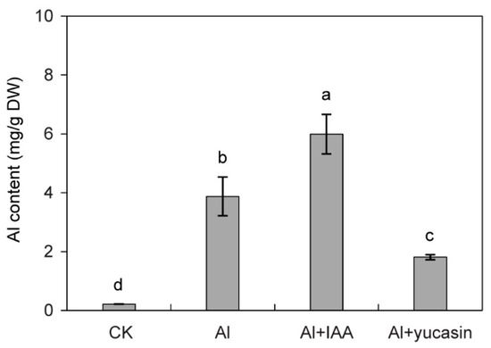 Effects of IAA and yucasin on Al concentration in tomato seedling roots under Al stress. Quantification analysis of Al3+ content in the tomato seedlings exposed or not to 50 μM AlCl3 (Al), 50 μM AlCl3 + 10 nM IAA (Al + IAA), 50 μM AlCl3 + 1 μM yucasin (Al + yucasin) treatment as indicated for 6 d (mean ± SD, n = 3). Letters above the columns indicate statistically different (ANOVA followed by Duncan test).