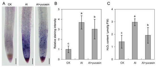 ROS include H2O2 and O2−, important signals for plants to respond to abiotic stresses. The appropriate level of ROS signal mediates plant response to stress by activating downstream resistance genes. Meanwhile, excessive ROS accumulation causes oxidative stress to plants, exacerbating the damage of stress to plants. To investigate whether yucasin mitigates Al toxicity in tomato seedlings by modulating ROS production, we analyzed the H2O2 content in tomato seedlings and monitored the level and distribution of O2− in tomato root tips using NBT staining. As shown in Figure 3, Al treatment triggers ROS production in tomato seedlings. ROS bursts mainly occurred in the meristematic and transitional zones of the tomato roots. In contrast, exogenous yucasin application significantly reduced ROS accumulation (Figure 3). The results suggest that plant root tips are the primary target sites for Al3+, while yucasin mitigates Al phytotoxicity by regulating Al-induced ROS accumulation in seedlings.