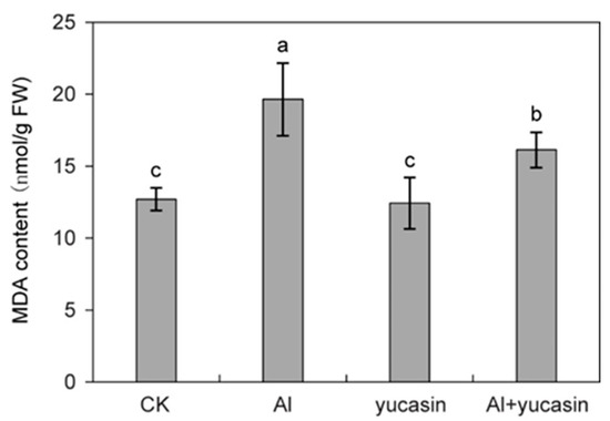 Yucasin alleviates Al-induced oxidative stress in tomato seedlings. Quantification of MDA content in the tomato seedlings exposed or not to AlCl3, yucasin, and AlCl3 + yucasin for 6 d (mean ± SD, n = 3). Letters above the columns indicate statistically different (ANOVA followed by Duncan test).