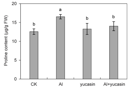 MDA is a byproduct of lipid peroxidation in cell membranes under oxidative stress conditions. Its content is an indicator of the extent of plasma membrane oxidative damage. To evaluate oxidative damage induced by Al stress, the MDA levels in tomato seedlings were analyzed. Consistent with the ROS accumulation, the MDA content in tomatoes significantly increased under Al stress (Figure 4). When yucasin was applied, the accumulation of MDA content caused by Al stress was significantly reduced (Figure 4). These results suggested that yucasin alleviates Al toxicity by reducing ROS accumulation and peroxidation damage. Proline is an important regulatory substance in plants’ response to stress. It has the functions of stabilizing the membrane structure and regulating cell osmotic potential. Tomato seedlings exposed to Al stress showed an increase in proline content (Figure 5). Yucasin application reduced Al-induced proline accumulation (Figure 5).