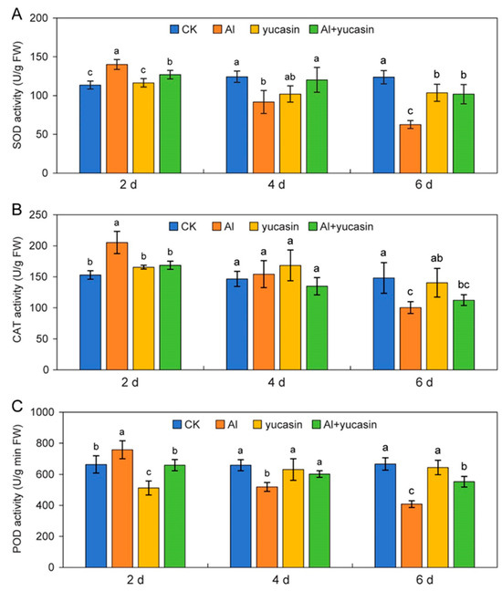 Maintaining the dynamic balance of ROS by scavenging excessively accumulated ROS is an important regulatory mechanism to protect plants from oxidation stress. It was shown that AlCl3 treatments resulted in an elevation of ROS levels in tomato seedlings, with a notable O2– accumulation observed in root tips (Figure 3A–C). Plants cope with oxidative stress by regulating the activities of ROS-scavenging enzymes, which include SOD, POD, and CAT. As depicted in Figure 6, the activities of SOD, POD, and CAT in tomato seedlings exhibited a trend of initially increasing and subsequently decreasing during Al toxicity (Figure 6A–C). Two days after Al treatment, the activities of these enzymes significantly increased (Figure 6A–C). With the prolongation of AlCl3 treatment (4 or 6 d), the enzyme activities significantly decreased (Figure 6A–C). This indicated that plants cope with excessive ROS production by increasing the antioxidant enzyme activity within the early stage of Al conditions. However, with the prolongation of Al treatment, the antioxidant enzyme activity in plants is significantly inhibited (Figure 6A–C). After 6 d of Al treatment, the SOD, CAT, and POD activity significantly decreased (Figure 6A–C). Applying yucasin for 6 d to the Al-treated tomato seedlings increased the SOD, CAT, and POD activity by 62.5%, 12%, and 35.4%, respectively, compared to the Al treatments (Figure 6A–C).