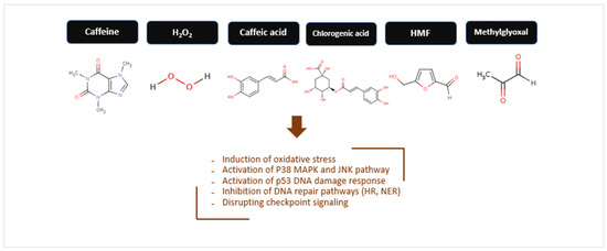 Tucker et al. [86] evaluated the genotoxicity of 1,2-dicarbonyl compounds (e.g., glyoxal, methylglyoxal, kethoxal) found in coffee using CHO cells and human lymphocytes. Glyoxal, methylglyoxal, and kethoxal induced sister chromatid exchanges (SCEs), indicating DNA damage. H2O2 also increased SCEs, highlighting oxidative stress as a key factor. Bisulfite reduced the genotoxic effects, suggesting that reactive carbonyl compounds play a role in food-related genotoxicity.