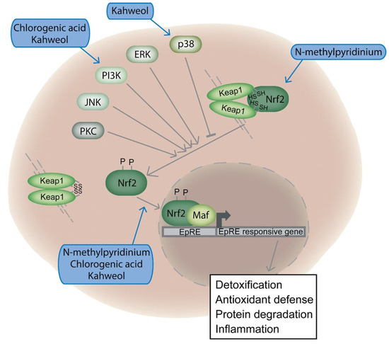 - Boettler, U.; Sommerfeld, K.; Volz, N.; Pahlke, G.; Teller, N.; Somoza, V.; Lang, R.; Hofmann, T.; Marko, D. Coffee constituents as modulators of Nrf2 nuclear translocation and ARE (EpRE)-dependent gene expression. J. Nutr. Biochem. 2011, 22, 426–440. [Google Scholar] [CrossRef] [PubMed]