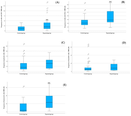 - Cobanoglu, H.; Coskun, M.; Coskun, M.; Çayir, A. Results of Buccal Micronucleus Cytome Assay in Pesticide-Exposed and Non-Exposed Group. Environ. Sci. Pollut. Res. 2019, 26, 19676–19683. [Google Scholar] [CrossRef]