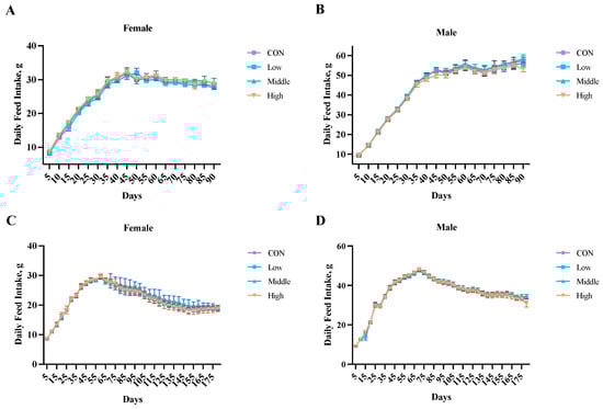 Effects of sublancin on the daily food intake of SD rats fed for the subchronic ((A,B); 90-day; n = 10/sex/group) and chronic ((C,D); 180-day; n = 20/sex/group) toxicity trials (g/day/rat). Each point represents the mean ± SD. CON group, basal diet; Low group, basal diet + 2000 mg/kg; Middle group, basal diet + 10,000 mg/kg; High group, basal diet + 50,000 mg/kg.