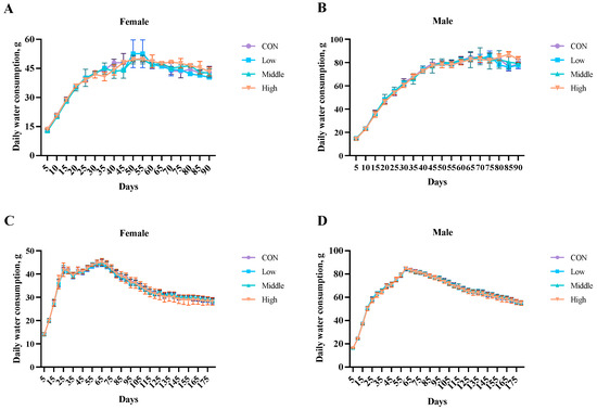 Effects of sublancin on the daily water intake of SD rats fed for the subchronic toxicity trial ((A,B); 90-day; n = 10/sex/group) and chronic ((C,D); 180-day; n = 20/sex/group) toxicity trials (g/day/rat). Each point represents the mean ± SD. CON group, basal diet; Low group, basal diet + 2000 mg/kg; Middle group, basal diet + 10,000 mg/kg; High group, basal diet + 50,000 mg/kg.