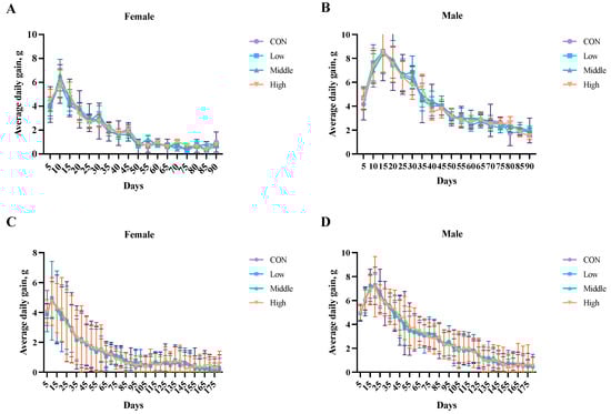 Effects of sublancin on the average daily gain of SD rats fed for the subchronic ((A,B); 90-day; n = 10/sex/group) and chronic ((C,D); 180-day; n = 20/sex/group) toxicity trials (g/day/rat). Each point represents the mean ± SD. CON group, basal diet; Low group, basal diet + 2000 mg/kg; Middle group, basal diet + 10,000 mg/kg; High group, basal diet + 50,000 mg/kg.