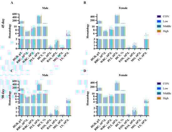Blood samples were collected for hematological analysis from 5 males and 5 females in each experimental group on Day 45 (midpoint) and Day 90 (endpoint) of the study. The following hematological parameters were analyzed: hemoglobin (HGB), red blood cell count (RBC), white blood cell count (WBC), platelet count (PLT), hematocrit (HCT), eosinophils (EOS), basophils (BAS), monocytes (MO), and lymphocytes (LY).