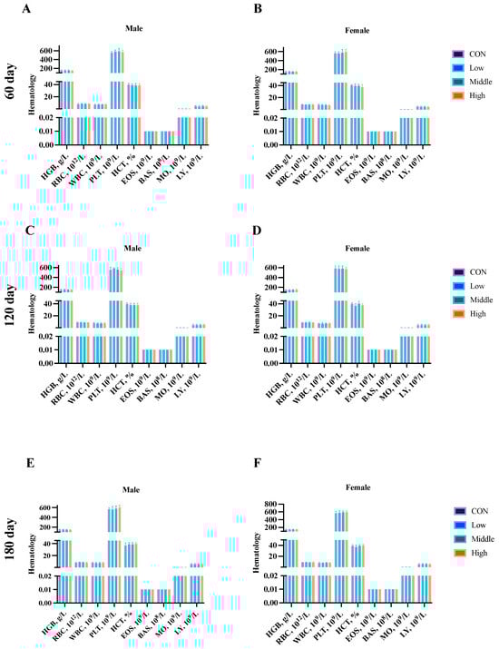 Effects of sublancin on the hematology of SD rats fed for 60 (A,B), 120 (C,D) and 180 (E,F) days during the chronic toxicity trial (n = 5/sex/group). Each point represents the mean ± SD. CON group, basal diet; Low group, basal diet + 2000 mg/kg; Middle group, basal diet + 10,000 mg/kg; High group, basal diet + 50,000 mg/kg. HGB, hemoglobin; RBC, red blood cell count; WBC, white blood cell count; PLT, platelet count; HCT, hematocrit; EOS, eosinophils; BAS, basophils; MO, monocytes; LY, lymphocytes.