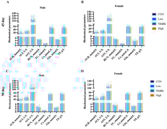 Effects of sublancin on the biochemical parameters of SD rats fed for 45 (A,B) and 90 (C,D) days during the subchronic toxicity trial (n = 5/sex/group). Each point represents the mean ± SD. The data were compared for statistical significance with the same-sex control group. CON group, basal diet; low group, basal diet + 2000 mg/kg; middle group, basal diet + 10,000 mg/kg; high group, basal diet + 50,000 mg/kg. ALB, albumin; ALT, alanine aminotransferase; AST, aspartate aminotransferase; BUN, blood urea nitrogen; TC, total cholesterol; Cr, creatinine; Glu, glucose; TP, total protein.