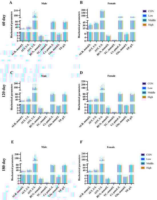 Effects of sublancin on the serum biochemical parameters of SD rats fed for 60 (A,B), 120 (C,D) and 180 (E,F) days during the chronic toxicity trial (n = 5/sex/group). Each point represents the mean ± SD. CON group, basal diet; Low group, basal diet + 2000 mg/kg; Middle group, basal diet + 10,000 mg/kg; High group, basal diet + 50,000 mg/kg. ALB, albumin; ALT, alanine aminotransferase; AST, aspartate aminotransferase; BUN, blood urea nitrogen; TC, total cholesterol; Cr, creatinine; Glu, glucose; TP, total protein.