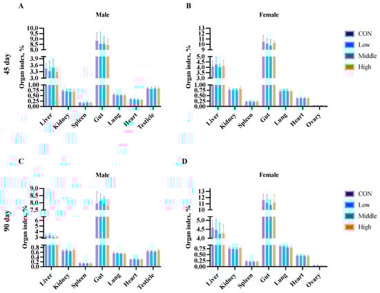 Effects of sublancin on the organ index of SD rats fed for 45 (A,B) and 90 (C,D) days during the subchronic toxicity trial (n = 5/sex/group). Each point represents the mean ± SD. CON group, basal diet; Low group, basal diet + 2000 mg/kg; Middle group, basal diet + 10,000 mg/kg; High group, basal diet + 50,000 mg/kg.