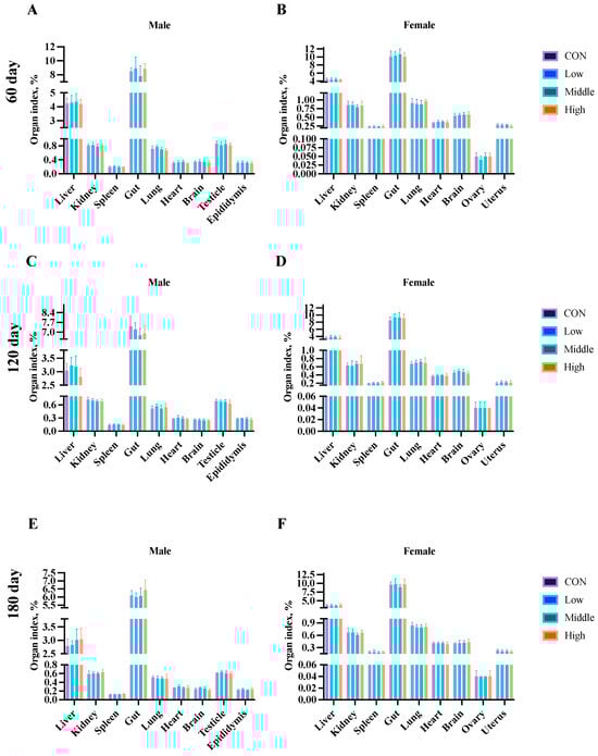 Effects of sublancin on the organ index of SD rats fed for 60 (A,B), 120 (C,D) and 180 (E,F) days during the chronic toxicity trial (n = 5/sex/group). Each point represents the mean ± SD. CON group, basal diet; Low group, basal diet + 2000 mg/kg; Middle group, basal diet + 10,000 mg/kg; High group, basal diet + 50,000 mg/kg.