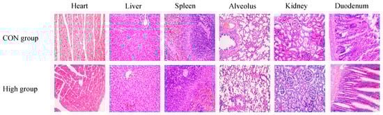 Histological sections of various tissues (heart, liver, spleen, alveolus, kidneys, and duodenum) from SD rats subjected to 90-day subchronic toxicity testing with sublancin (H&E staining, 40×). CON group, basal diet; High group, basal diet + 50,000 mg/kg.