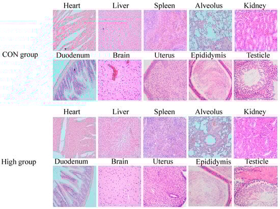 Histological sections of various tissues (heart, liver, spleen, alveolus, kidneys, duodenum, brain, and reproductive tissues) from SD rats subjected to 180-day chronic toxicity testing with sublancin (H&E staining, 40×). CON group, basal diet; High group, basal diet + 50,000 mg/kg.