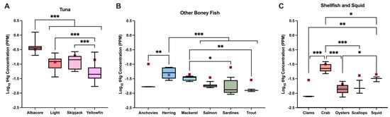 tHg concentrations vary significantly across species. Total Hg concentrations, wet weight (WW), in (A) albacore tuna (n = 44), light tuna (n = 27), skipjack tuna (n = 11), and yellowfin tuna (n = 13), (B) anchovies (n = 3), herring (n = 6), mackerel (n = 4), salmon (n = 9), sardines (n = 7), and trout (n = 3), and (C) clams (n = 3), crab (n = 6), oysters (n = 6), scallops (n = 3), and squid (n = 3); one-way ANOVA, * p < 0.05, ** p < 0.01, *** p < 0.001. Maroon squares indicate average concentration as reported by Karimi et al., 2012 []. Graphs indicate mean, min, max.