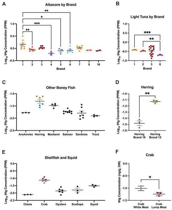 tHG concentrations in this study differ across brands and meat types. One-way ANOVA of log10-transformed tHg concentrations in (A) albacore tuna, (B) light tuna, (C) other bony fish, (D) t-test between herring from Brand 18 and Brand 15, One-way ANOVA in (E) shellfish and squid, and (F) t-test between crab white meat and lump meat; one-way ANOVA and t-test, * p < 0.05, ** p < 0.01, *** p < 0.001. Graphs indicate mean ± SD.