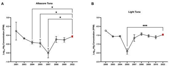 tHG concentrations in this study are comparable to those previously reported by the FDA. One-way ANOVA of log(x+1)-transformed tHg concentrations in (A) albacore tuna and (B) light tuna; one-way ANOVA, * p < 0.05, *** p < 0.001. Data shown for the years 2000–2010 were compiled from the FDA’s previously published data set (black data points), while the data shown for 2022 represent the data analyzed in this study (red data point). Graphs indicate mean ± SD.