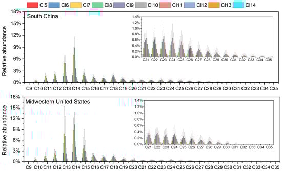 Mean relative abundance with standard deviation error bars of CP homologues in house dust samples from South China and Midwestern U.S.